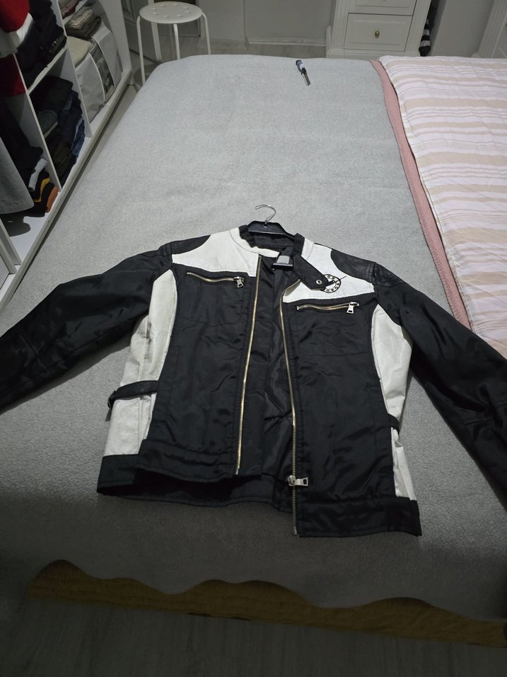 Fermuarlı detaylara sahip, uzun kollu ve yaka kısmı kesik olan siyah beyaz biker mont. Orta boy ve bayan motorcu tarzi sportmen mont cok havalı