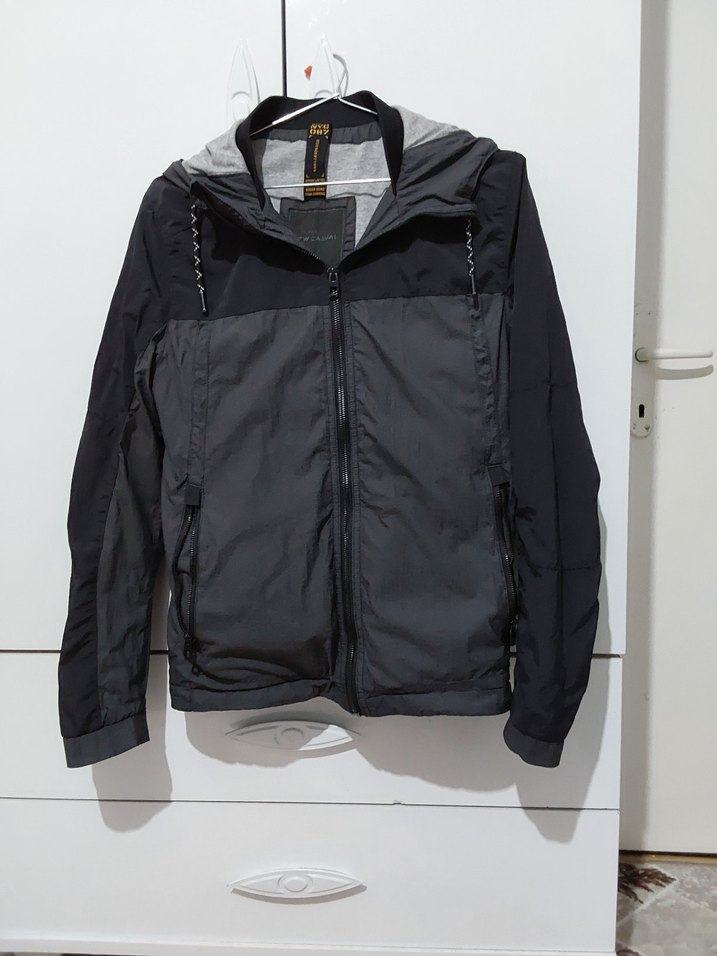Fermuarlı, notalı yaka detaylı, uzun kollu, siyah ve gri renkli, sentetik kumaştan yapılmış, normal boyda erkek yağmurluğu. ️