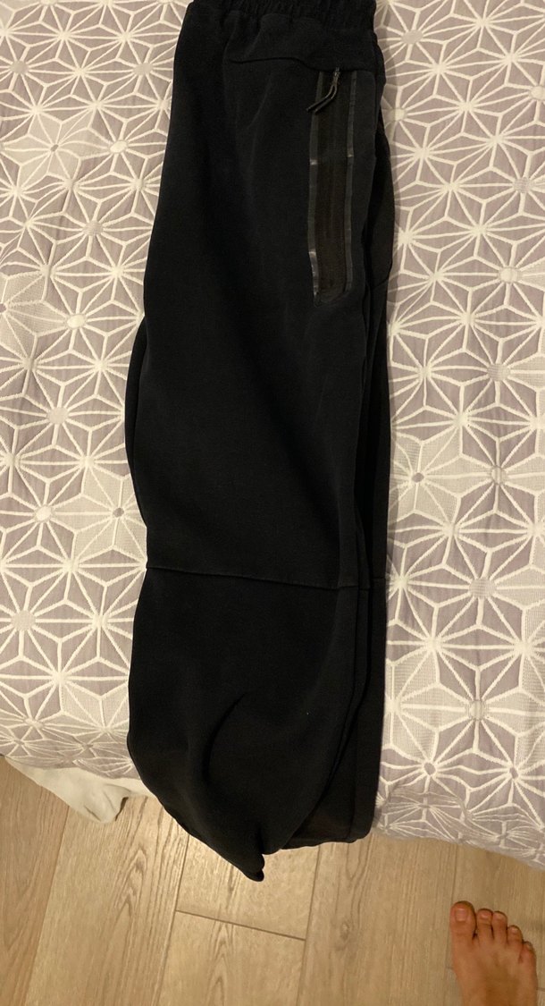 Fermuarlı cepleri ve sentetik kumaşıyla siyah, dar kesim hamile eşofman altı. Midi boy, günlük sokak stili için uygun.
