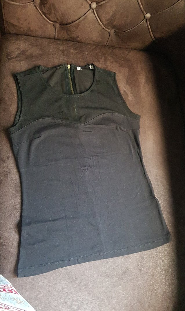 Fermuarlı, yuvarlak yakalı, siyah, ince kesim, kadın atlet. Düz ve sentetik kumaştan, günlük şık dış mekan kullanımı için uygun.