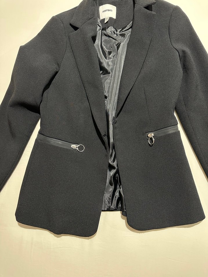 Fermuarlı cepleri ve kesimli yakası olan siyah kadın blazer ceket. Sentetik kumaştan, normal midi boyda, ofis ve günlük goth tarzına uygun.