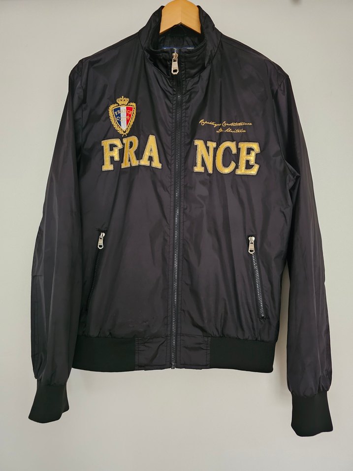 Fermuarlı cepleri ve baskılı detayları olan, sentetik kumaştan yapılmış, siyah ve dar kesim bomber ceket. Günlük kullanıma uygun, bisiklet yakalı ve uzun kollu.