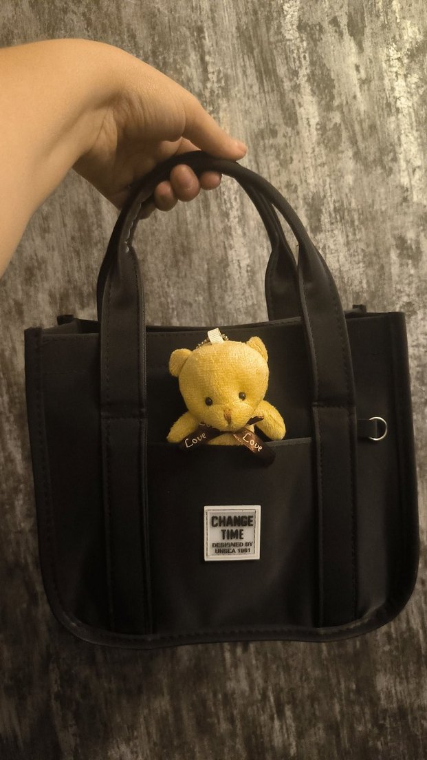 Fermuarlı cepli, baskılı siyah kadın çantası. Yumuşak kumaş ve sarı ayıcık aksesuarı ile trendy sokak stiline uygun.