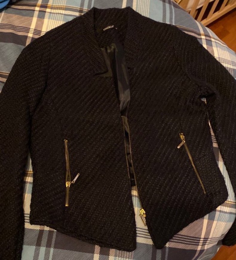 Fermuarlı cepler ve fermuarlı kapanışı olan siyah, dar kesim kadın ceket. Uzun kollu, kesik yaka ve günlük kullanıma uygun.