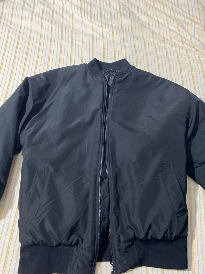Düz siyah, fermuarlı, uzun kollu ve yakalı kadın ceketi. İnce kesimi ve sentetik kumaşıyla minimalist tasarıma sahip, günlük kullanıma uygundur.