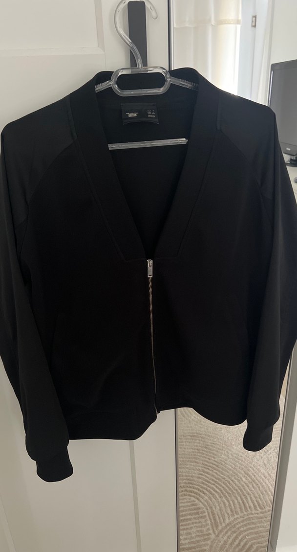 Fermuarlı, kesimli siyah kadın ceket. Normal midi uzunlukta, uzun kollu ve ofis için uygun, şık sokak tarzı görünüme sahip. Yumuşak kumaştan.