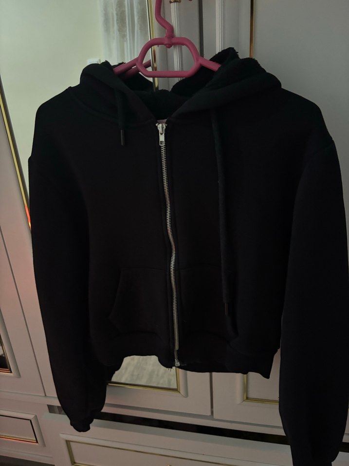 Fermuarlı, uzun kollu, bisiklet yaka ve yumuşak kumaştan yapılmış siyah, dar kesim kadın sweatshirt. Günlük rahat kullanım için uygundur.