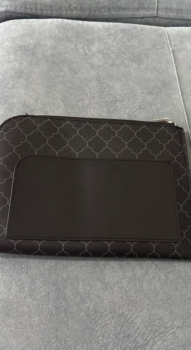 Fermuarlı kapanışı ve siyah sentetik kumaş üzerinde desenli modeliyle kadın clutch çanta. Günlük iş kullanımı için şık ve sade tasarım.