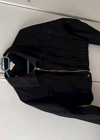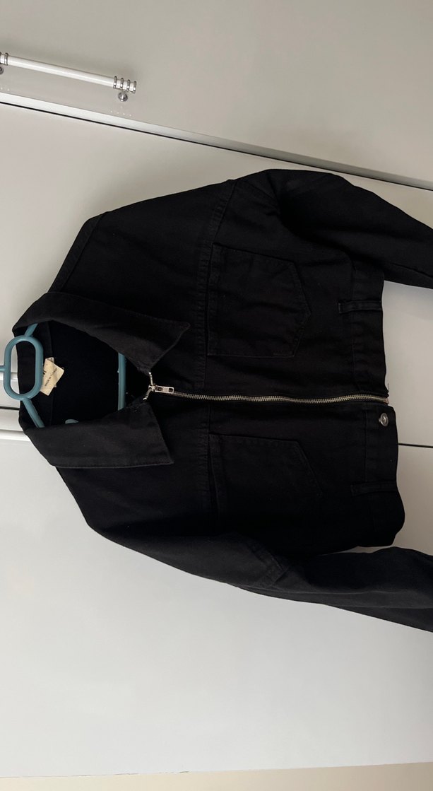 Fermuarlı siyah denim ceket, keskin yaka ve uzun kollu. Sokak stiline uygun, günlük kullanıma ideal, vücuda oturan kesim.