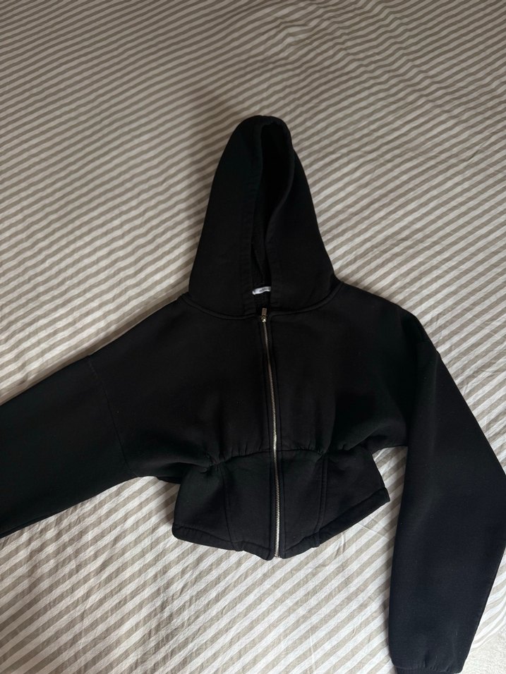Fermuarlı, kapüşonlu, uzun kollu, siyah kadın sweatshirt. Normal midi boyda, yumuşak ve sıcak kumaştan, rahat ve şık.