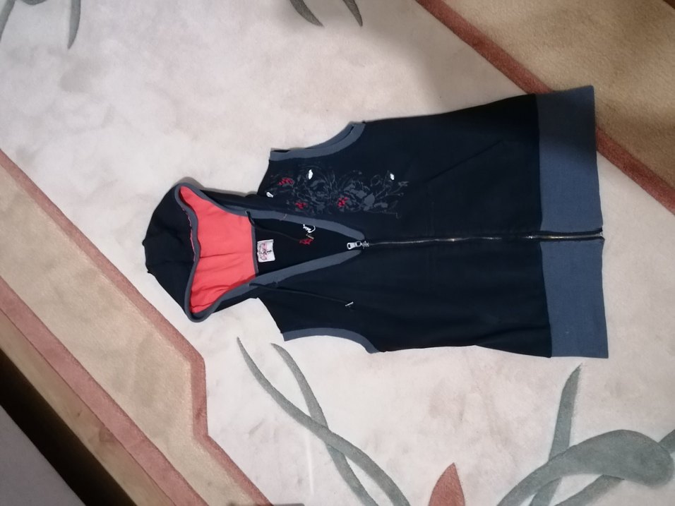 Fermuarlı, V yaka, kapüşonlu ve baskılı tasarımlı, yumuşak ve sıcak kumaştan yapılmış siyah kadın yelek. Şık ve rahat sokak stili için uygundur.