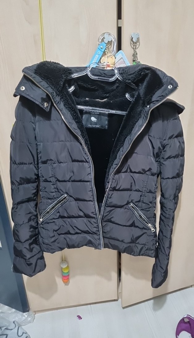 Fermuarı bozuk ve fermuar kenarlarindaki suni deri artik yok soyulmuş. notalı yaka ve şerit kollu, siyah, normal uzunlukta, sıcak tutan kumaştan kadın kışlık mont.