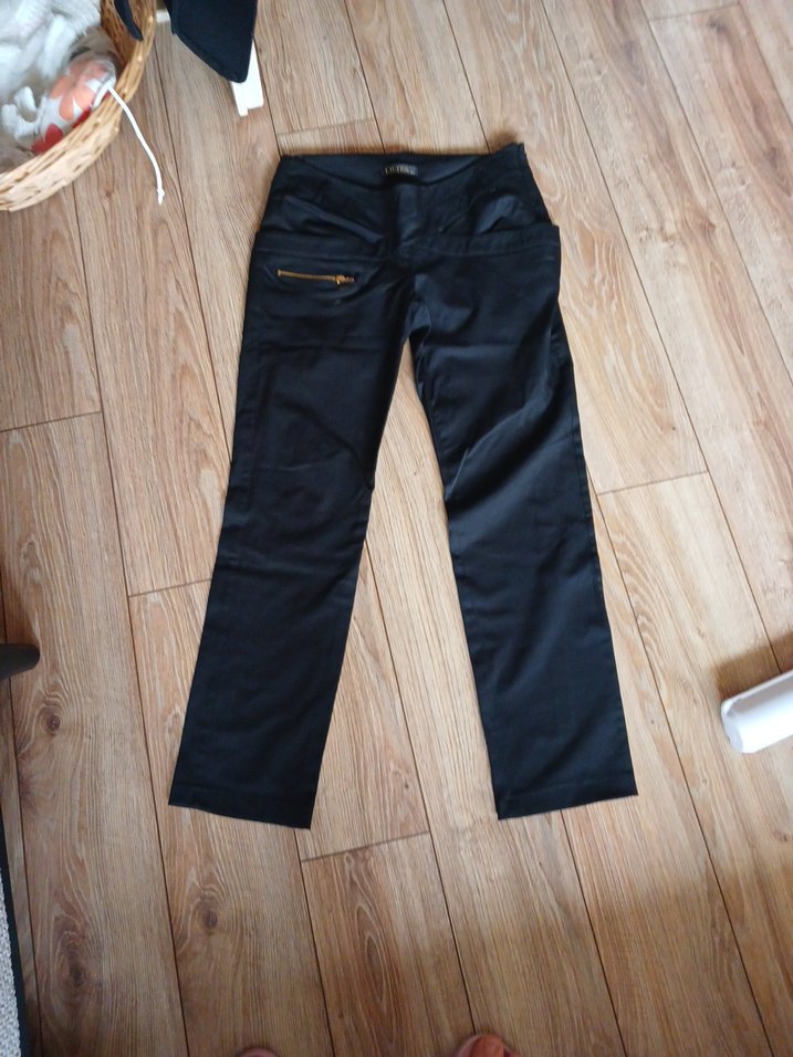 Fermuarlı detaylı, sentetik kumaştan yapılmış, siyah ve dar kesim kadın pantolon. Midi boy, günlük sokak stili için uygundur. ebatlar bel 42 basen 45 boy 90