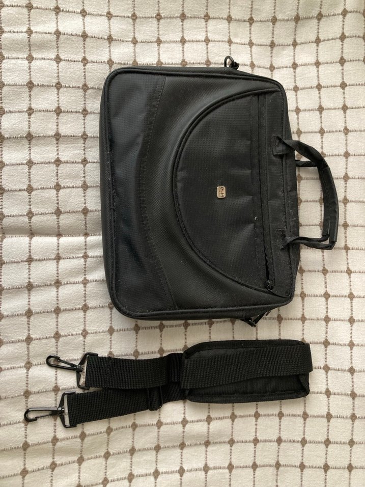 Fermuarlı tasarıma sahip siyah laptop çantası, sentetik kumaştan üretilmiş, günlük iş kullanımı için uygundur. Ayarlanabilir omuz askısı ve elde taşıma kulpları bulunur. ️