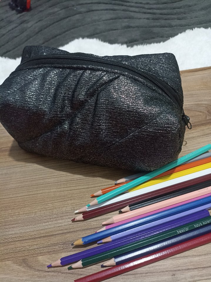 Fermuarlı kapanışa sahip siyah kadın makyaj çantasıdır. Sentetik kumaştan yapılmış, desen içermeyen koyu renk tasarımıyla avant-garde ve goth tarzlara uygundur.