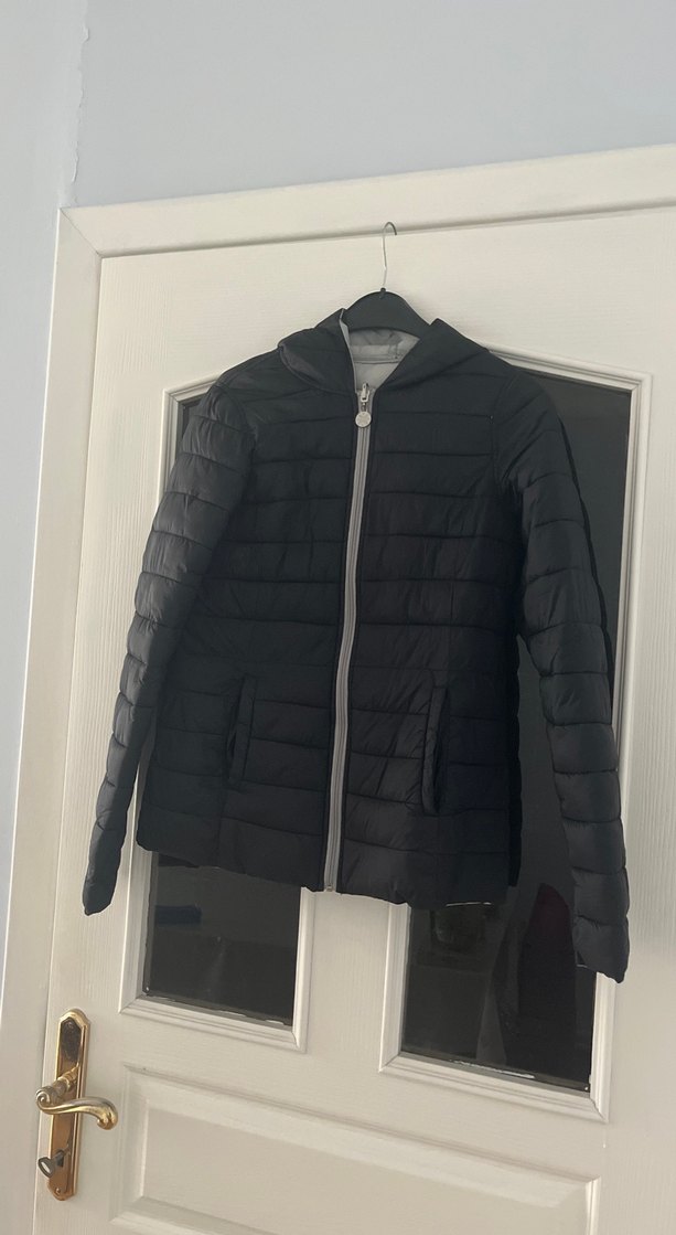 Fermuarlı, uzun kollu, siyah kadın mont. Yumuşak ve sıcak kumaştan, normal boyda, yakası kesik ve günlük kullanıma uygun.