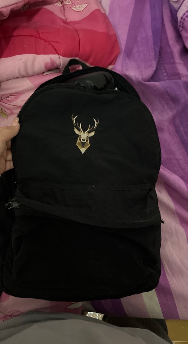 Yumuşak kürk dokulu, fermuarlı siyah kadın sırt çantası. Üzerinde geyik baskısı bulunur ve dış mekan kullanımı için uygundur.