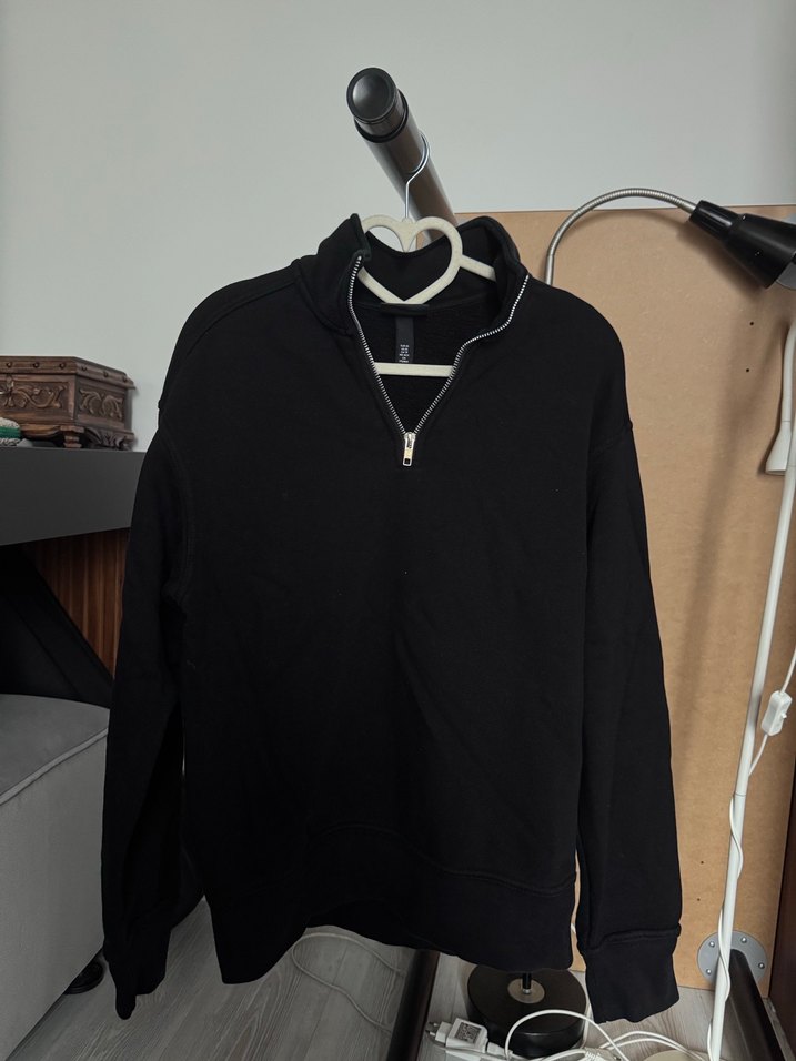 Siyah kadın sweatshirta, fermuarlı yakalı, uzun kollu ve bol kesim özellikleriyle rahat bir görünüm sunar. Yumuşak ve sıcak kumaştan üretilmiştir, günlük kullanım için uygundur.