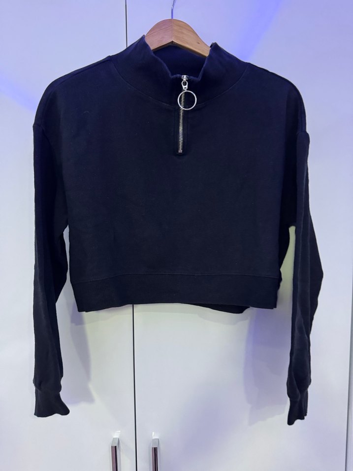 Fermuarlı ön kısmı, yüksek yaka ve uzun kollu, siyah, kısa kesim, yumuşak ve sıcak kumaştan, günlük kullanıma uygun dar kesim kadın sweatshirtü.