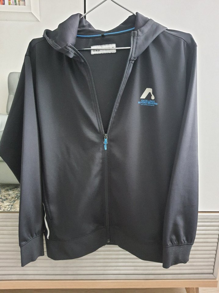 Bu siyah erkek sweatshirtü, kapüşonlu ve fermuarlı, uzun kollu ve vücuda oturan kesime sahiptir. Göğüste küçük baskılı logo bulunur, spor ve sokak tarzına uygundur.