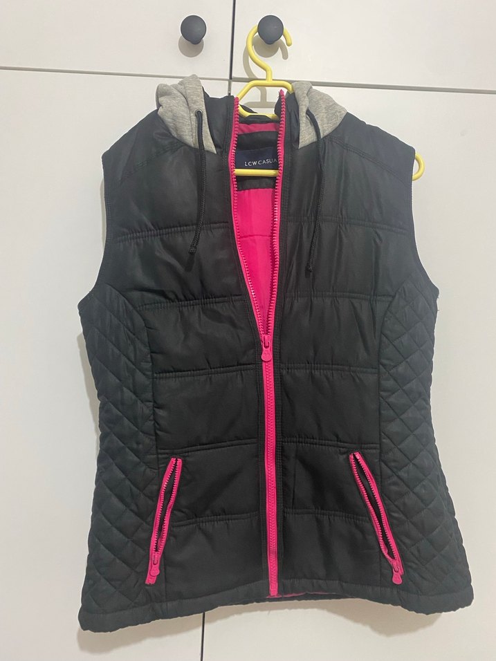 Fermuarlı, kapüşonlu, yüksek yakalı, siyah kadın yelek. Yanları kapitone detaylı, pembe fermuarlı, sıcak ve yumuşak kumaştan üretilmiştir. LCW marka yeni sorunsuz