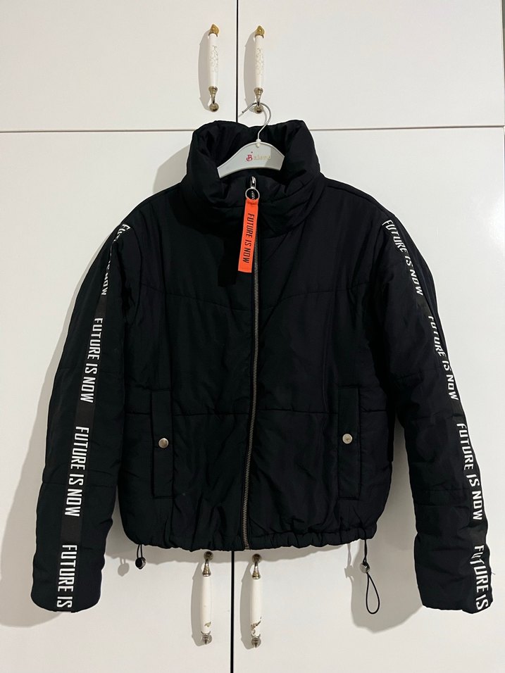 Yumuşak kumaştan yapılmış, fermuarlı ve yüksek yakalı siyah kısa ceket. Kollarında baskılı yazılar ve ayarlanabilir askılar bulunur.