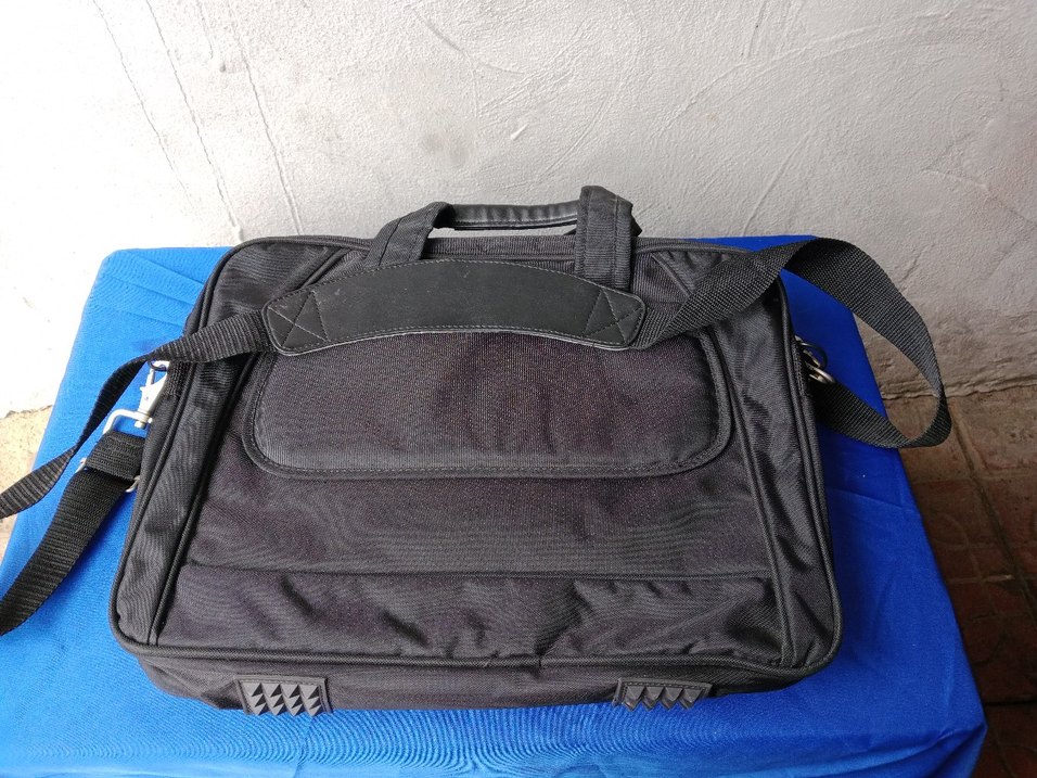Fermuarlı kapama ve dayanıklı sentetik kumaştan yapılmış siyah kadın laptop çantası. Düz tasarımı iş ve ofis kullanımı için uygundur.