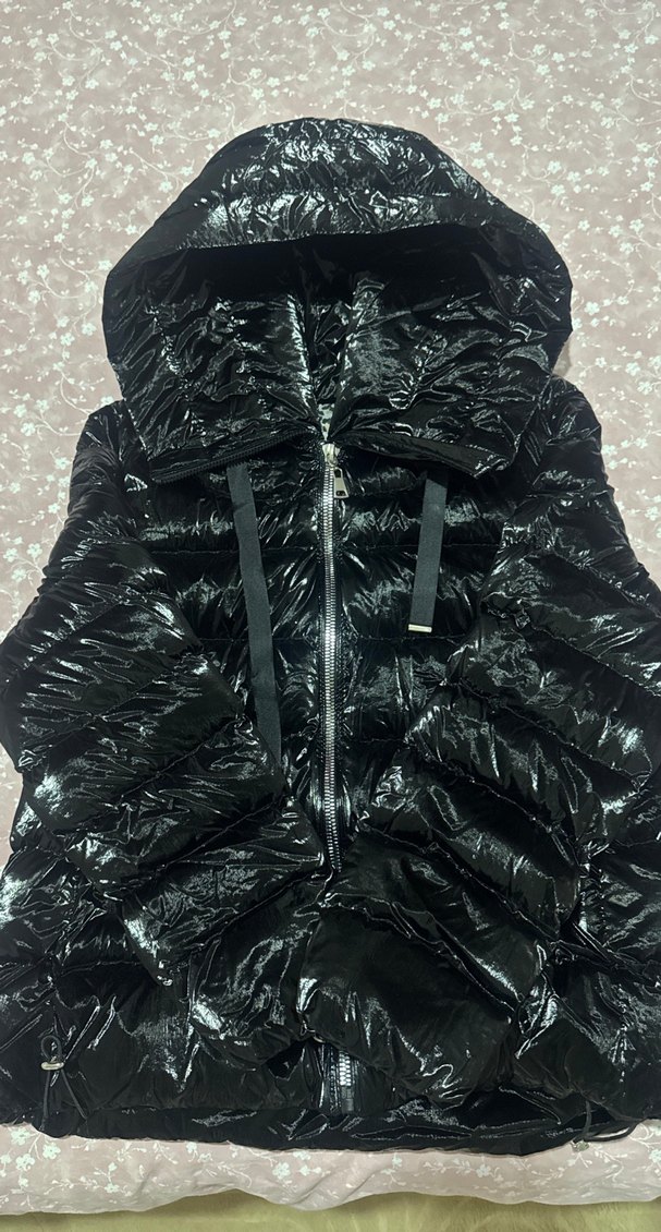 Fermuarlı ön kısmı ve koyu leopar deseniyle parlak siyah kadın montu. İç kısmı leopar desenli astarlı. Marka: Robin.