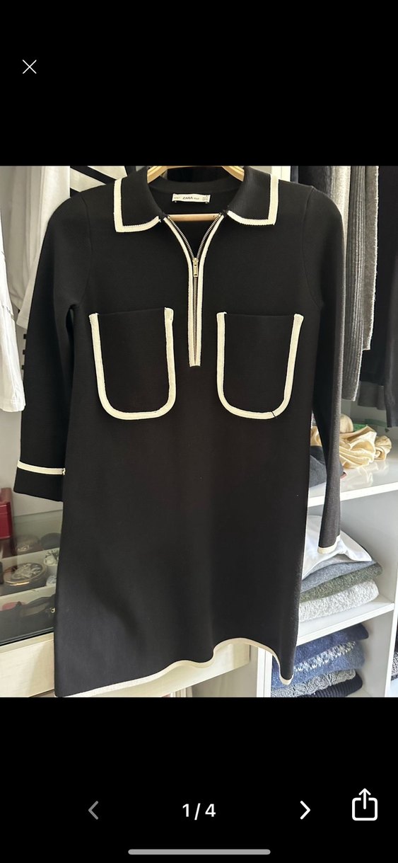Siyah midi elbise, uzun kollu, yakalı ve ön fermuarlı. Beyaz detaylı iki cep ve oturan kesimiyle günlük kullanıma uygun, sentetik kumaştan yapılmıştır.