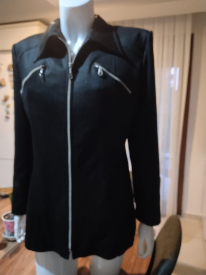 Fermuarlı, uzun kollu, siyah ve midi boyda hamile ceketi. Notlu yaka ve rahat, sıcak dokusu ile ofis kullanımı için uygundur.