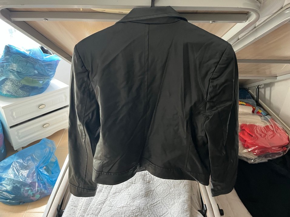 Düğmeli, siyah midi uzunluğunda kadın ceketi. Notch yaka ve uzun kollu, sentetik kumaştan, iş ortamı için uygun şık tasarım.