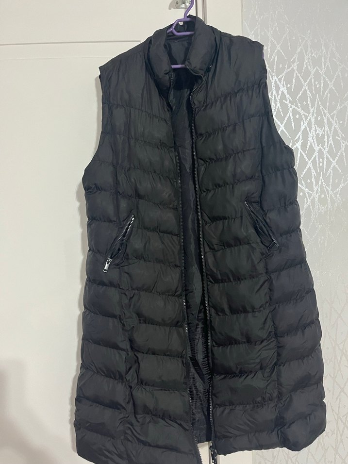 Fermuarlı cepleri ve yüksek yakası olan siyah, kolsuz midi yelek. Sentetik kumaştan, rahat ve şık bir sokak stili sunar.