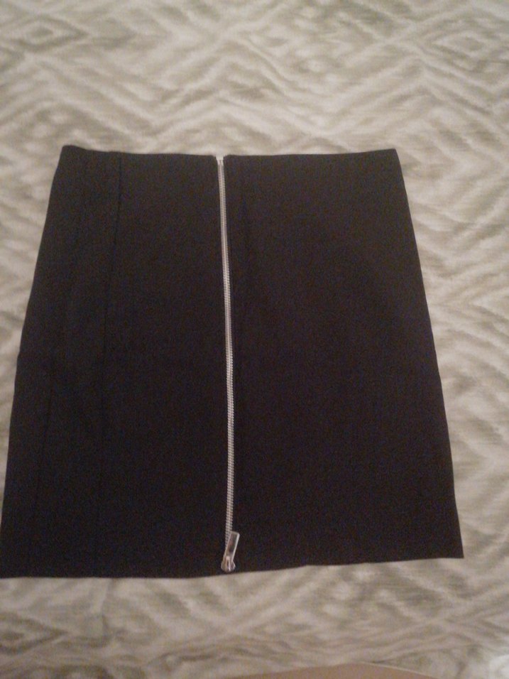 Sentetik kumaştan yapılmış, ön fermuarlı, siyah, dar kesim midi mini etek. Minimalist goth tarzıyla ofis kullanımı için uygundur.