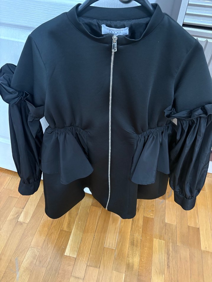 Fermuarlı önü, bağcıklı uzun kolları ve bol kesimiyle siyah mini ceket. Sentetik kumaştan, günlük kullanıma uygun, sokak tarzı şıklığı sunar.