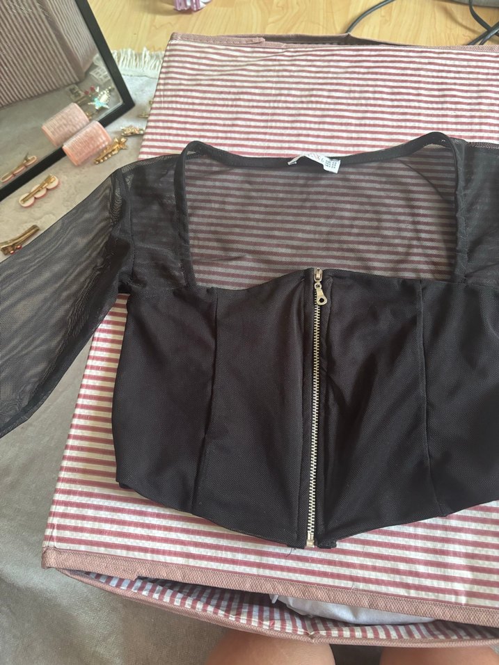 Fermuarlı, straplez yakalı, ince askılı, siyah mini bluz. Sentetik kumaştan, fit kesim ve desen yok. Gotik tarzda şık bir parça.