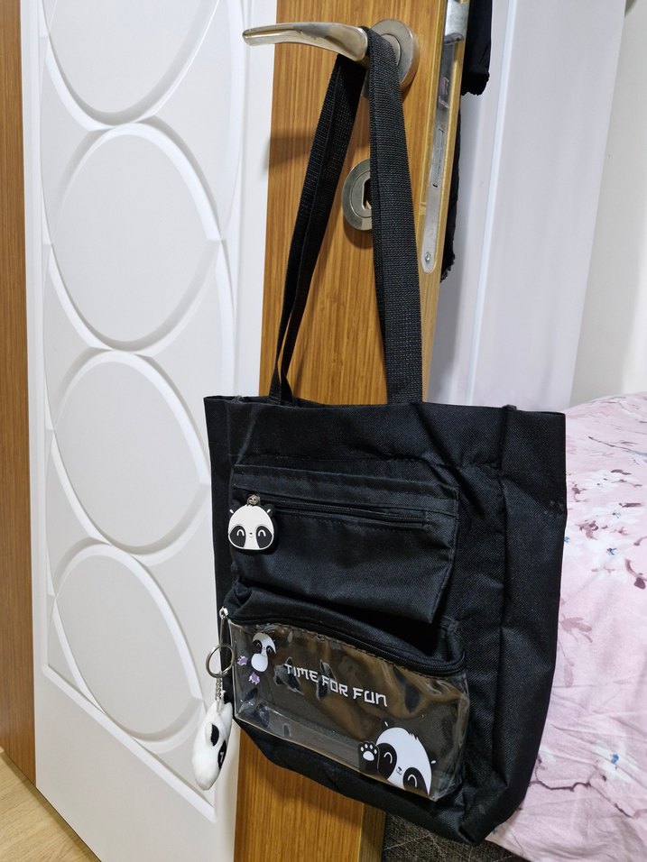 Fermuarlı tasarıma sahip siyah plastik kadın çantası, baskılı panda detayları ve şeffaf ön cep içerir. Trendy, gündelik goth tarzına uygun.