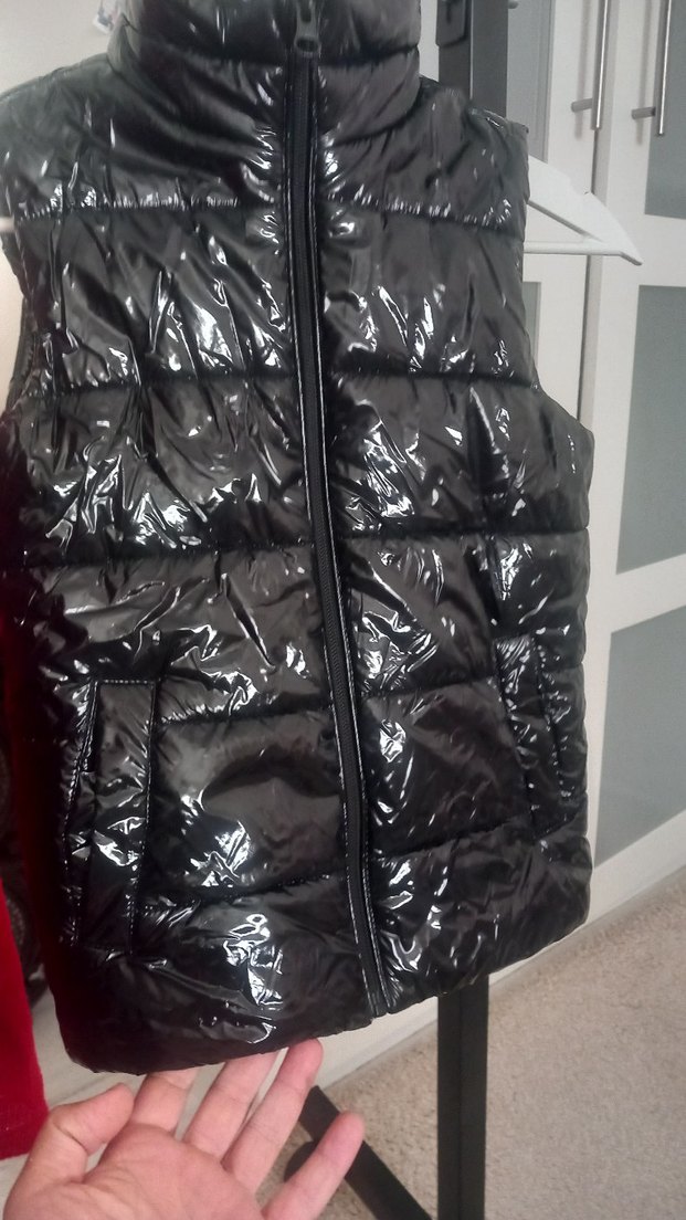 Parlak sentetik kumaştan yapılmış, fermuarlı ve yüksek yakalı siyah, oturan kesim kadın yelek. Gotik esintili, rahat ve dış mekan kullanımı için uygundur.