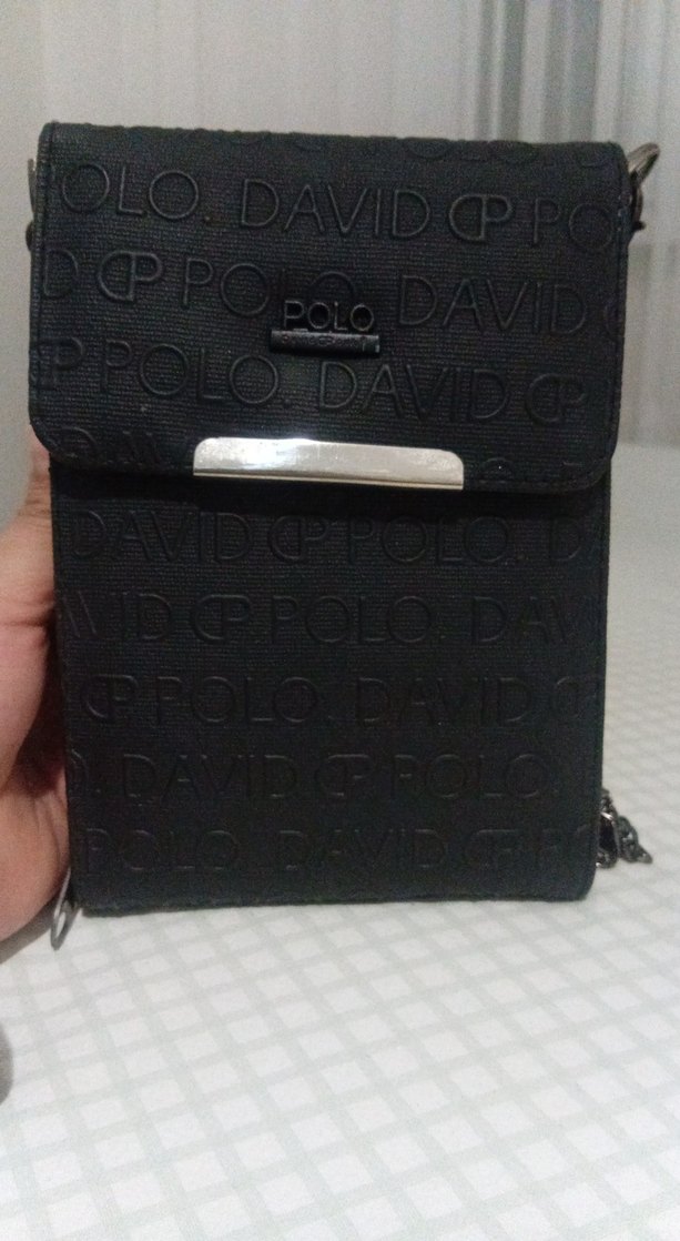 Fermuarlı bölmeli, Polo David desenli siyah kadın omuz çantası. Metal tokalı ve zincir askılı kompakt tasarım.