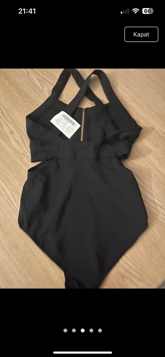 Fermuarlı ve baskılı detaylı, askısız, siyah renkli, vücuda oturan kadın mayosu, romantik buluşmalar için uygun.