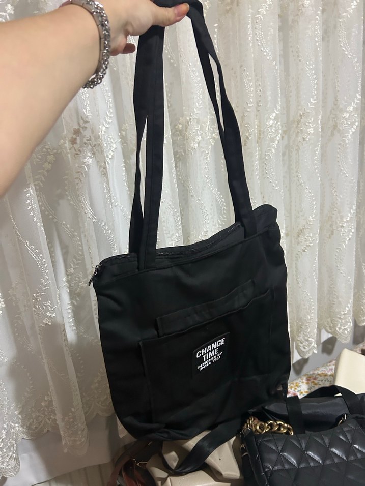 Fermuarlı kapaklı, baskılı siyah sentetik kumaş kadın çantası. Sokak stiline uygun, günlük kullanıma elverişli. Üzerinde "CHAE" yazısı bulunur.