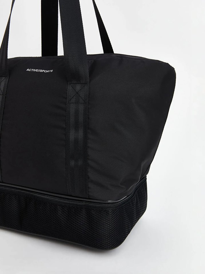 Fermuarlı ve alt kısmı file bölmeli siyah kadın spor çantası. Sentetik kumaştan üretilmiş, çağdaş ve spor tarzlara uygundur.