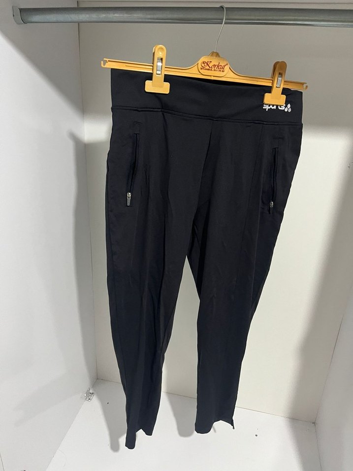Siyah, fermuarlı cepleri olan, sentetik kumaştan yapılmış, normal midi boyda, dar kesim kadın spor taytı.