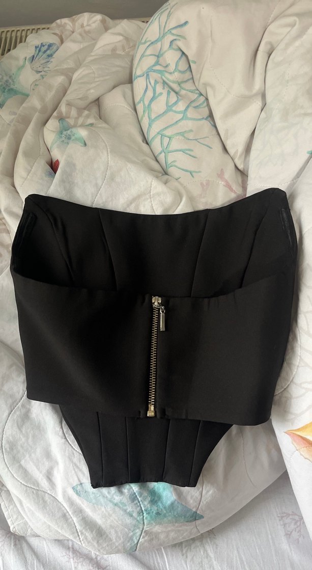 Fermuarlı, straplez yakalı siyah büstiyer. Sentetik kumaştan, midi boyda ve dar kesim. Avant-garde goth tarzını yansıtır.