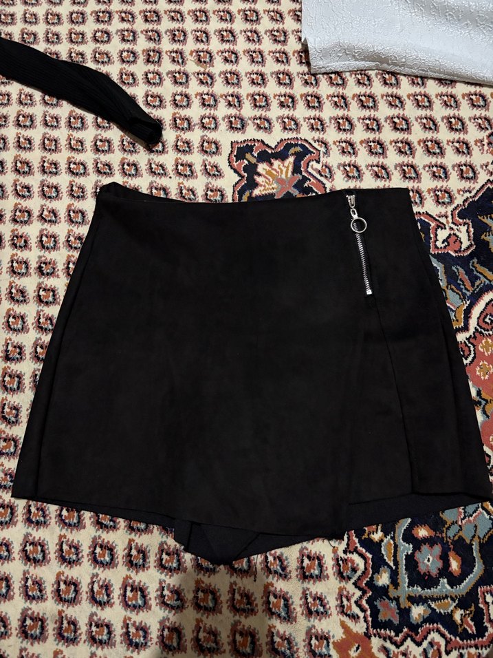 Siyah süet mini etek, bol kesim ve fermuar detayıyla sokak modası ve bohem tarzı birleşiyor. Günlük kullanıma uygun.
