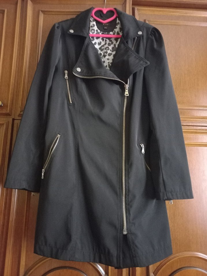 Fermuarlı cepleri ve notched yaka detayı olan, sentetik kumaştan yapılmış, strappy kollu siyah trençkot.Goth Paris tarzında, günlük kullanıma uygun. 40-42 bedenede olur.