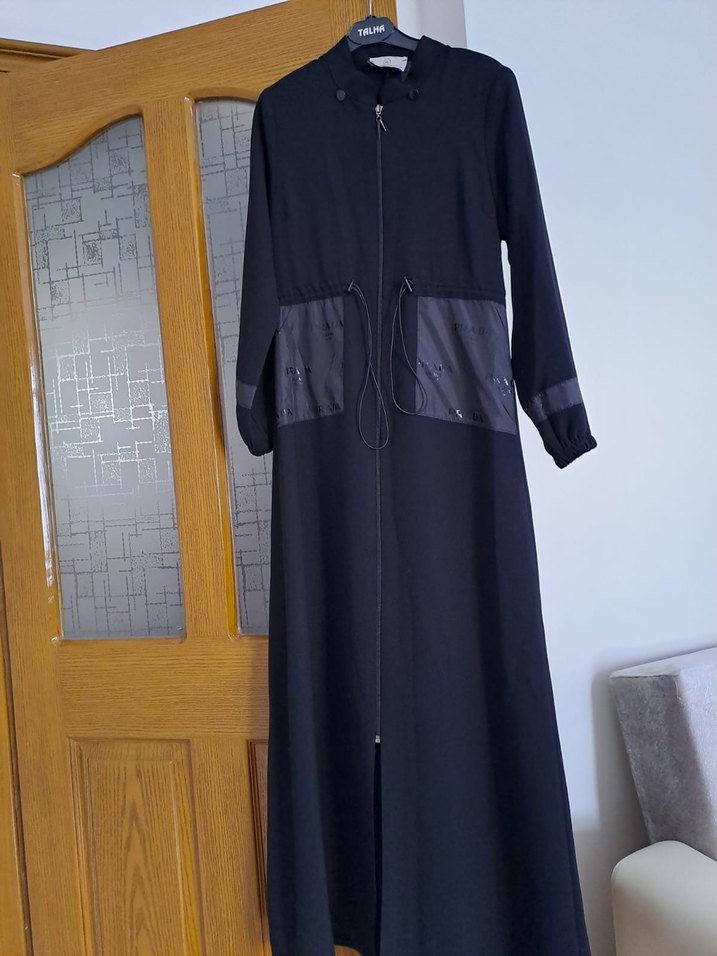 Siyah uzun kaban, fermuarlı cepler ve ön fermuar kapamalı, uzun kollu ve kesik yaka detaylıdır. Sentetik kumaştan yapılmış, minimalist tarzda günlük kullanım için uygundur.
