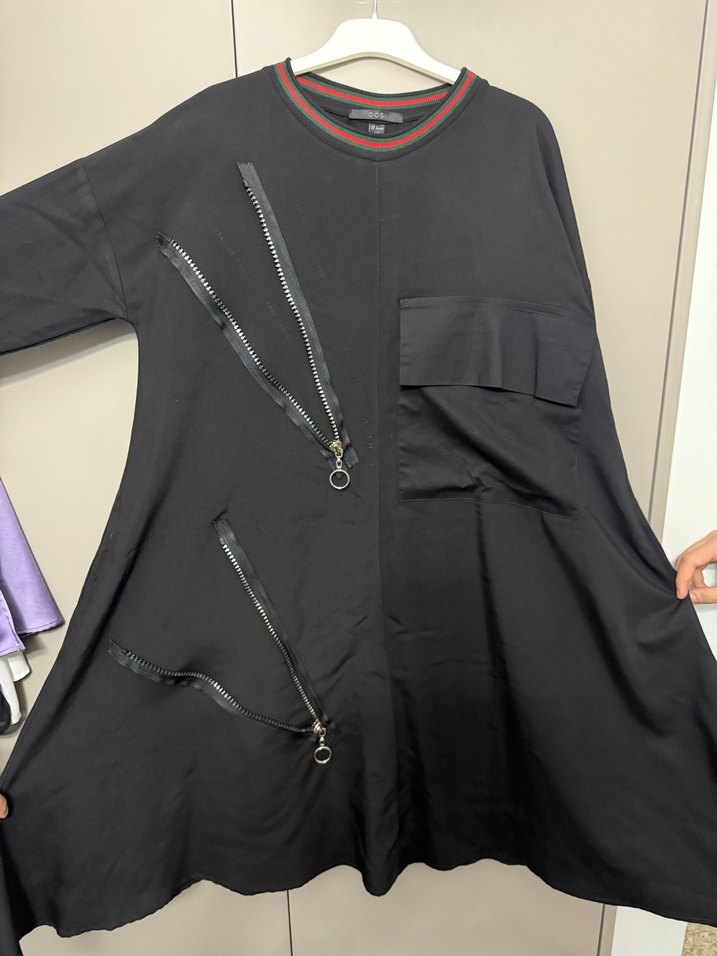 Siyah uzun, bol kesim kadın tunik. Uzun kollu, bisiklet yaka, fermuarlı detaylar ve ön cep bulunur. Sokak tarzı günlük kullanıma uygun.