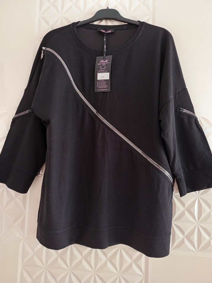siyah yuvarlak yakalı ve bol kesimdir. Ön ve kollarda fermuar detayları bulunur, 40,42 beden uyumlu ölçüleri resimde sıfır ürün