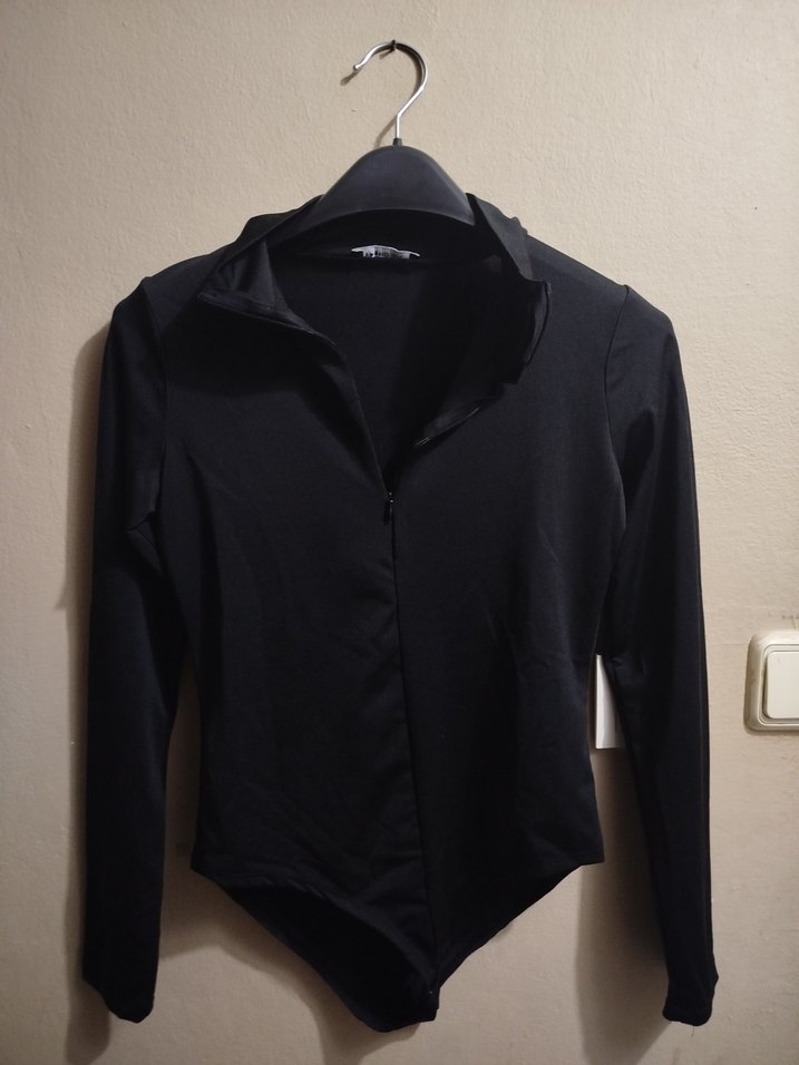Fermuarlı ön kısmı ve yüksek yakası olan, düz siyah renkte, uzun kollu, vücuda oturan kadın çıtçıtlı bluz. Minimalist ve gotik tarzda, günlük kullanıma uygun.