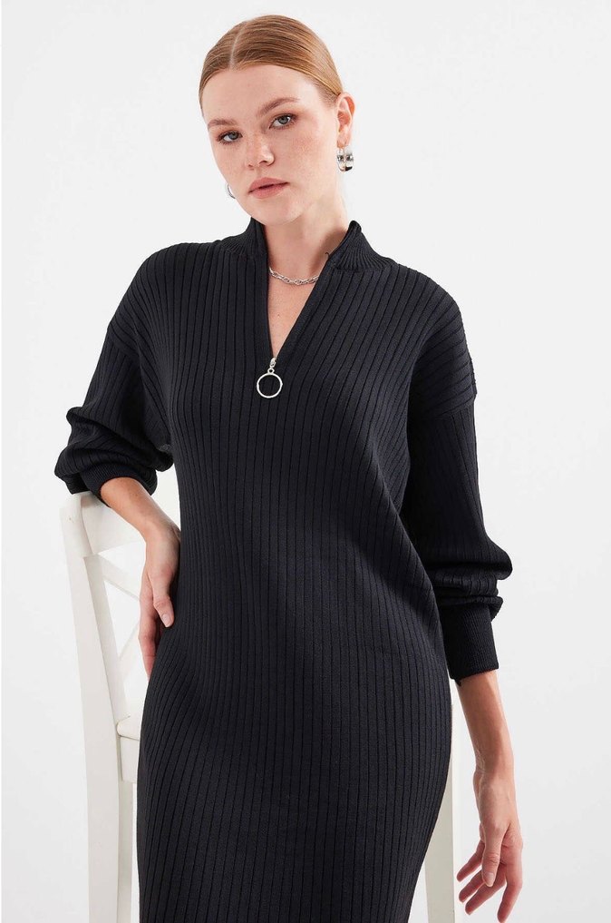 Fermuarlı Siyah Uzun Kollu Kadın Triko